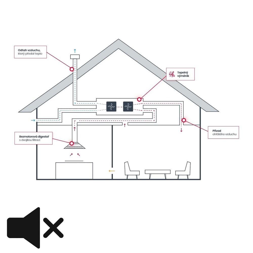 Páry a pachy z varné zóny odsává digestoř pomocí ventilačního systému rekuperace a odvádí je mimo dům. Čerstvý vzduch, který se vrací zpět do kuchyně, je odcházejícím vzduchem při chladném počasí předehříván, v teplých měsících naopak ochlazován.