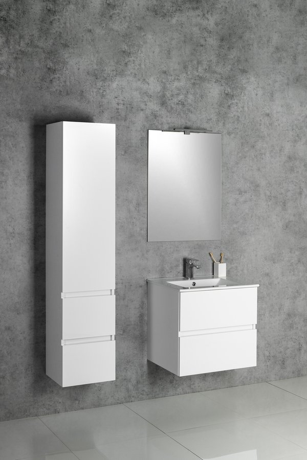Závěsná koupelnová skříňka s výškou 165cm. Tiché a plynulé zavírání zásuvek. Dřevěné police. Bílá ba...