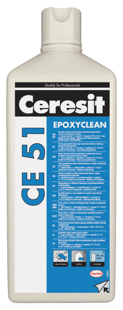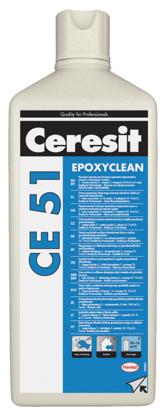 Ceresit CE 51 je speciální čistič na odstranění skvrn, zbytků a znečištění od epoxidových spárovacích hmot ze všech typů keramických obkladů a přírodních kamenů. Dá se použít jako neředěný prostředek na účinné odstranění skvrn a zbytků, po použití epoxidových hmot Ceresit CE 79 a Ceresit CE 89, a také na odstranění skvrn na leštěném porcelánu. Zároveň se dá použít na čištění aplikačního nářadí a nástrojů při zpracování epoxidů.