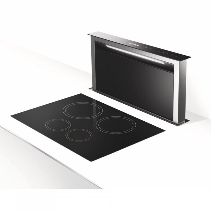 Digestoř Fabula je jedinečným modelem v kategorii výsuvných odsavačů - DownDraft. Instaluje se do pracovní desky za varnou plochu. Při zapnutí se sací část vysune z pracovní desky a začne odsávat. Odsává páry a pachy z prostoru nad varnou plochou a současně z prostoru celé kuchyně. Elegantní černé sklo zakrývá tukové kazetové filtry a umožňuje snadnější údržbu digestoře. Výsuvná část je o 10cm vyšší než podobné produkty jiných značek.