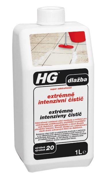 HG extrémně intenzivní čistič (HG super odstraňovač) je profesionální čistič pro odstraňování opravdu problematického znečištění nebo obtížně odstranitelných, i starých, filmů vosku, vrstvy leštidel nebo pro silné provozní znečištění. Dle potřeby a znečištění nařeďte HG extrémně intenzivní čistič (HG super odstraňovač) 1:10 (tj. 0,5 l na 5 l vody), a pro velmi silné nečistoty 1:4, vždy dle návodu na obalu. Naneste HG extrémně intenzivní čistič (HG super odstraňovač) roztok pomocí například houby nebo mopu v dostatečném množství na čištěný povrch. Povrch dobře vydrhněte kartáčem, popřípadě strojně. Poté nechte několik minut působit a ještě jednou vydrhněte. Následně HG extrémně intenzivní čistič (HG super odstraňovač) odstraňte z povrchu hadrem. Hadr pravidelně ždímejte a propírejte. Následně podlahu ještě jednou vytřete čistou vodou. V závislosti na stupni znečištění a ředění, vystačí HG extrémně intenzivní čistič (HG super odstraňovač) na 35-100m2 plochy podlahy.