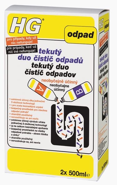 Vysoce účinný HG tekutý DUO čistič odpadů, speciálně vyvinutý pro extrémně ucpané kuchyňské, koupelnové a WC odpady. HG tekutý DUO čistič odpadů odstraňuje zbytky tuku a jídla, vlasy, zubní pastu, zbytky mýdla pod. Je bezpečný pro všechna potrubí.