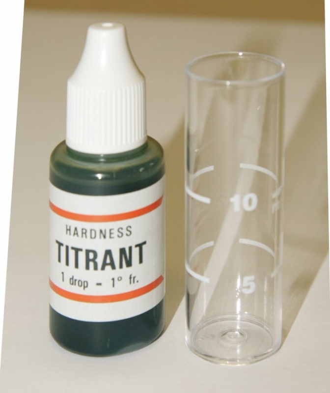 Kolorimetrický test tvrdosti vody ve francouzských stupních [°f = 0,1 mmol/l] cca. pro 200 měření změkčené vody.