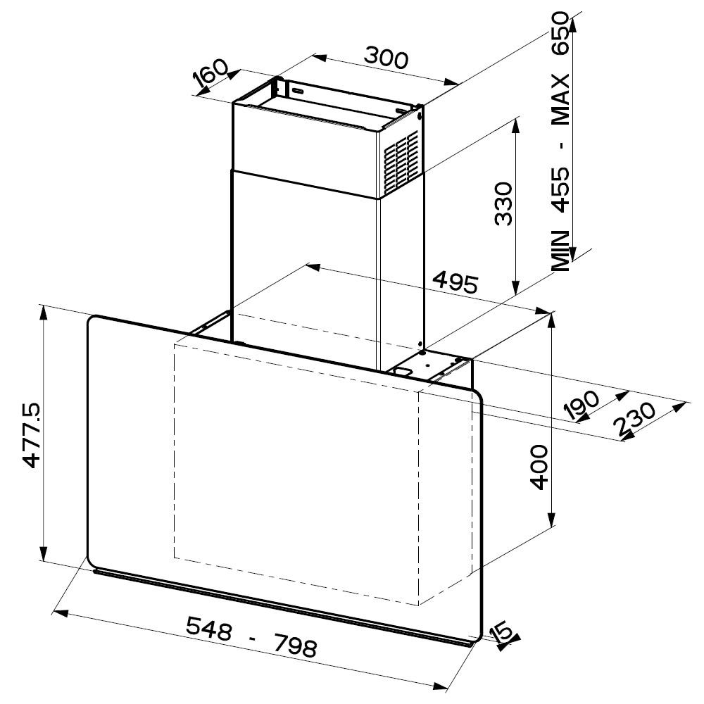 GLAM FIT, vůbec první zcela plochá vertikální skleněná digestoř, se vyznačuje ultratenkým tělem s hloubkou pouhých 19 cm. Díky tomu nepřekáží při vaření a činí kuchyň vzdušnější. Při zabudování digestoře mezi horní skříňky zároveň nevystupuje z jejich linie.
