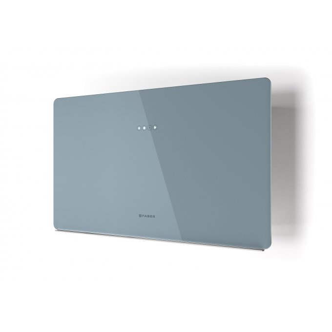 Atraktivní a přirozeně minimalistická nástěnná digestoř GLAM FIT ZERO DRIP s rovným panelem z popelavě modrého skla (RAL 240 60 15) vyzařuje eleganci v každém detailu.
