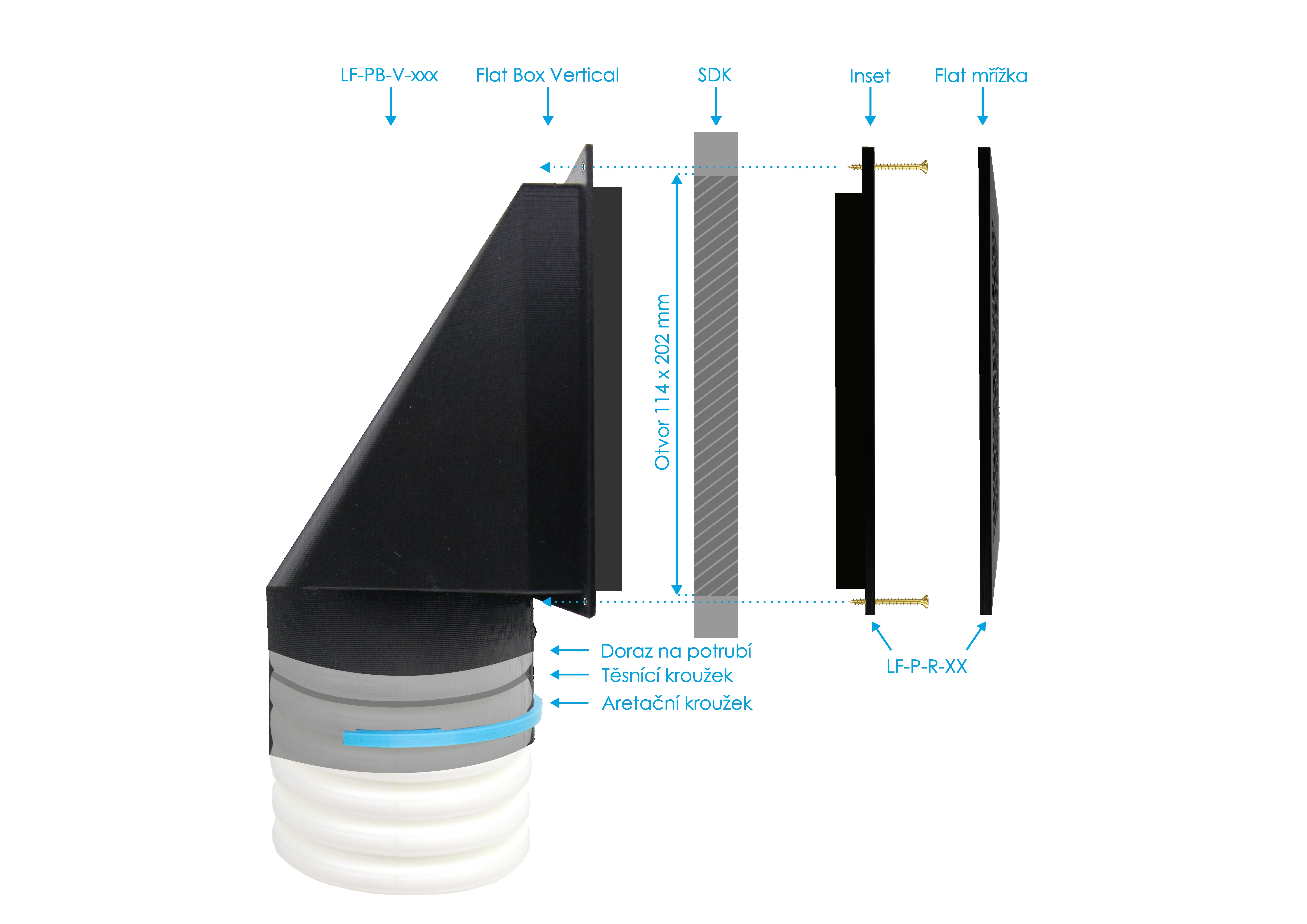 Mřížky LUFTOMET® Flat jsou dodávány vždy s INSETEM, který se vloží do boxu (LF-PB-*). INSET se následně spojí přes sádrokartonovou desku s boxem pomocí čtyř vrutů. Samotná designová mřížka se připevní k INSETU buď mechanicky (kovové mřížky) nebo pomocí magnetů (plastové mřížky).