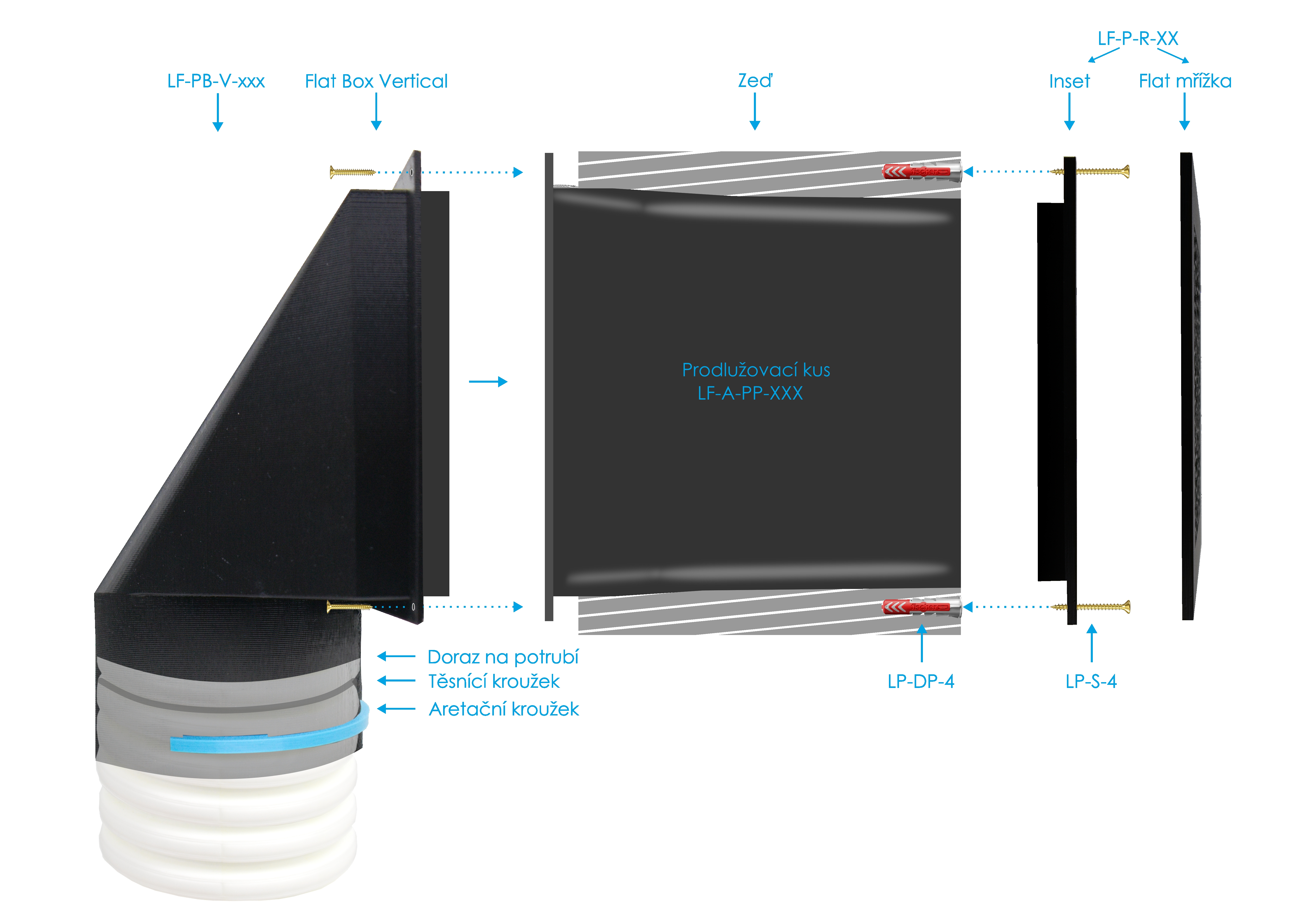 Jednotlivé typy boxů LUFTOMET® Flat a doporučené typy instalací - stavební detaily: