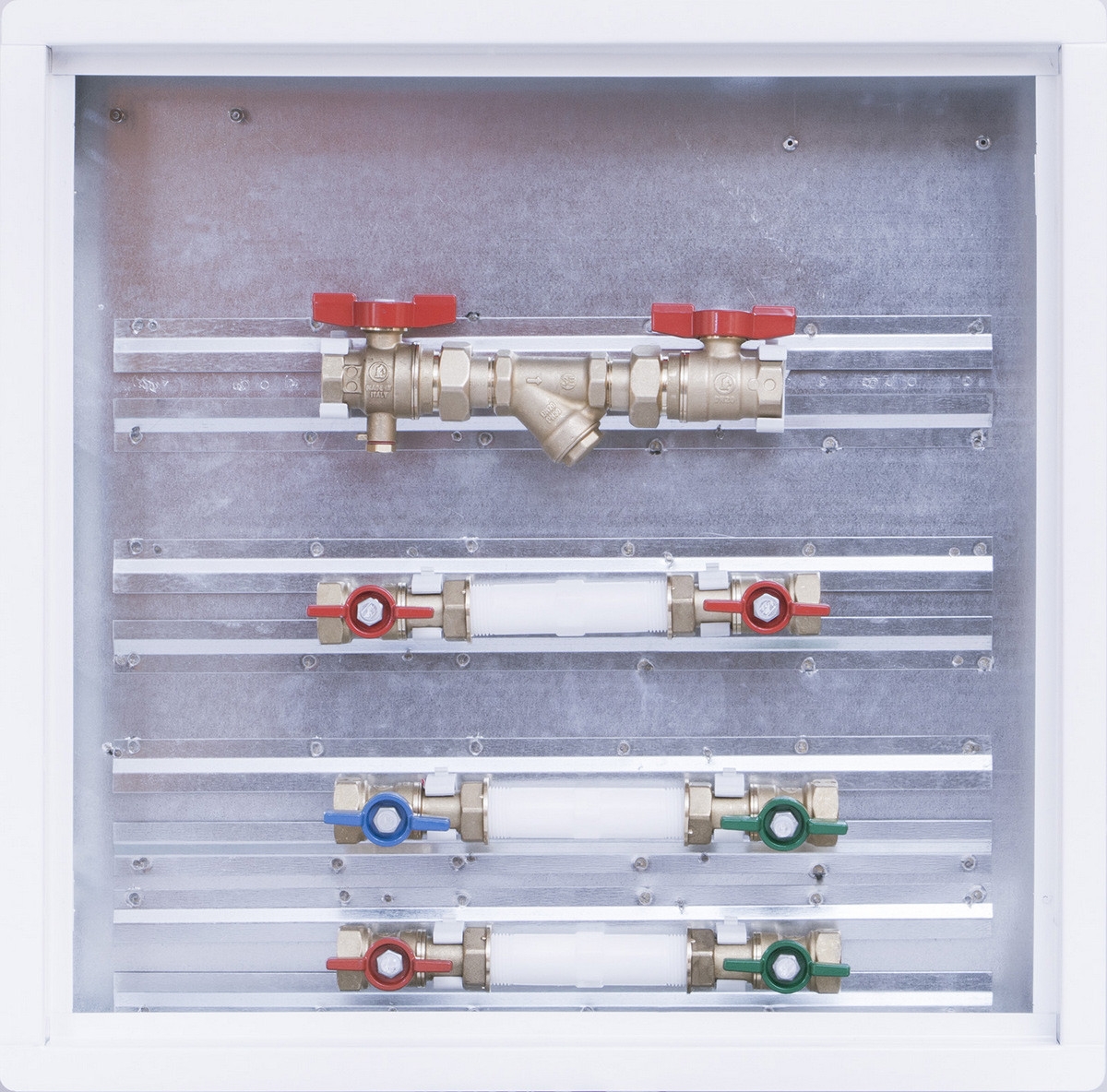 Modul pro měření spotřeby tepla s vyvažovacím ventilem a filtrem, sestavy TV + SV (měřiče a vodoměry nejsou součástí balení).
