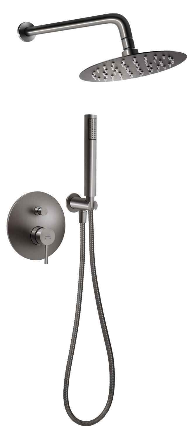 Sprchová podomítková baterie SET v Gun Metal. Včetně ruční a hlavové sprchy. Moderní design, skryté řešení, snadná montáž i údržba. Záruka 5 let na kartuši.
