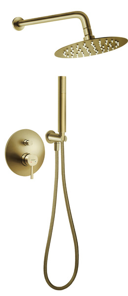 Sprchová podomítková baterie SET v kartáčovaném zlatu. Včetně ruční a hlavové sprchy. Moderní design, skryté řešení, snadná montáž i údržba. Záruka 5 let na kartuši.
