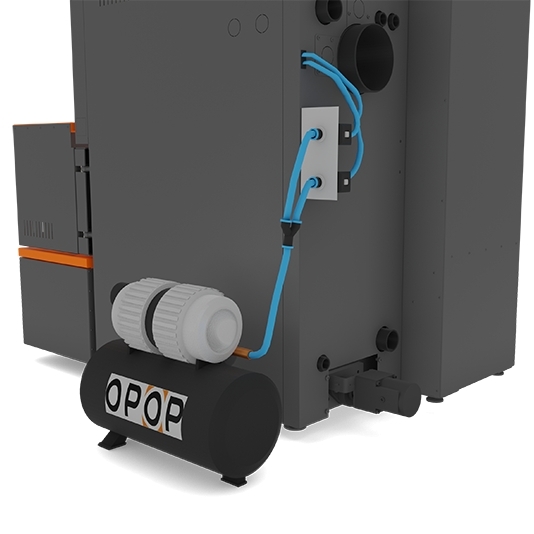 Automatické čištění pomocí kompresoru prodlouží intervaly mezi manuálním čištěním až na půl roku. Stlačeným vzduchem je pravidelně čištěn nejen rošt hořáku, ale i přepážky ve výměníku kotle. To vše je řízeno kotlem v pravidelných intervalech tak, aby výměník i hořák zůstávaly čisté po dlouhou dobu bez nutnosti ručního čištění. Pro čištění vzduchem nejsou použity žádné pohyblivé díly uvnitř kotle. Čištění je tak technicky jednoduché, bez rizika zaseknutí či poškození mechanických dílů teplem uvnitř kotle.