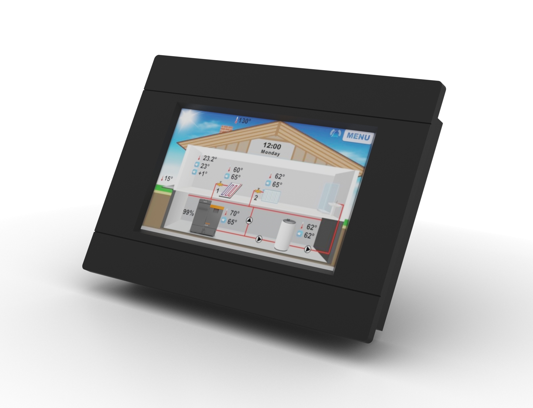 RT 10 Univerzální pokojový termostat je určen k ovládání a sledování pokojové teploty, teploty ústředního topení a teplé užitkové vody. Přístroj obsahuje týdenní topný program a pracuje se čtyřmi směšovacími ventily (s použitím další zařízení) jeho součástí je i rodičovský zámek na ochranu proti nechtěným změnám nastavení. Termostat má snadno čitelný velký grafický barevný dotykový displej, který usnadňuje čtení a změnu parametrů termostatu. Navíc můžete měnit teploty jak kotle, tak například teploty jednotlivých topných okruhů, akumulační nádoby, zásobníku teplé vody a tak dále. Součástí balení je i konstrukce, která usnadňuje montáž na stěnu. V případě, že je kotel připojen na internet je možné i vzdáleně měnit teplotu v objektu pomocí bezplatné aplikace ve vašem telefonu.