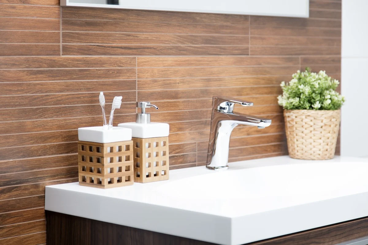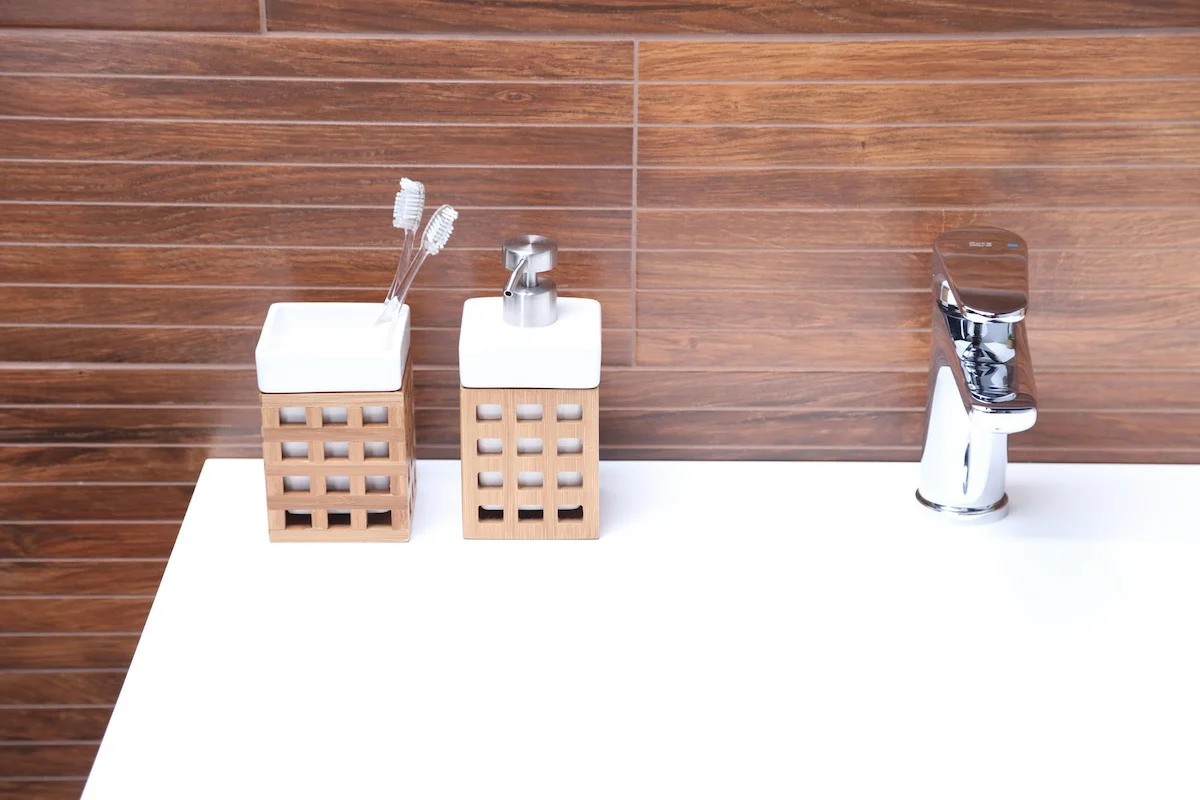 Elegantní volně stojící dávkovač mýdla s hranatým designem a z dřevěného materiálu, se snadno doplňu...