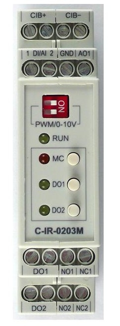 Univerzální rozšiřující modul k regulátoru IR - 2 analogové vstupy, 2 relé výstupy, 1x PWM nebo 0/10V, CIB - dvouvodičové připojení.
