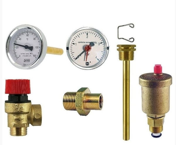 Sada obsahuje teploměr, tlakoměr, pojistný ventil, odvzdušňovací ventil, jímku, pružinku, vsuvku.