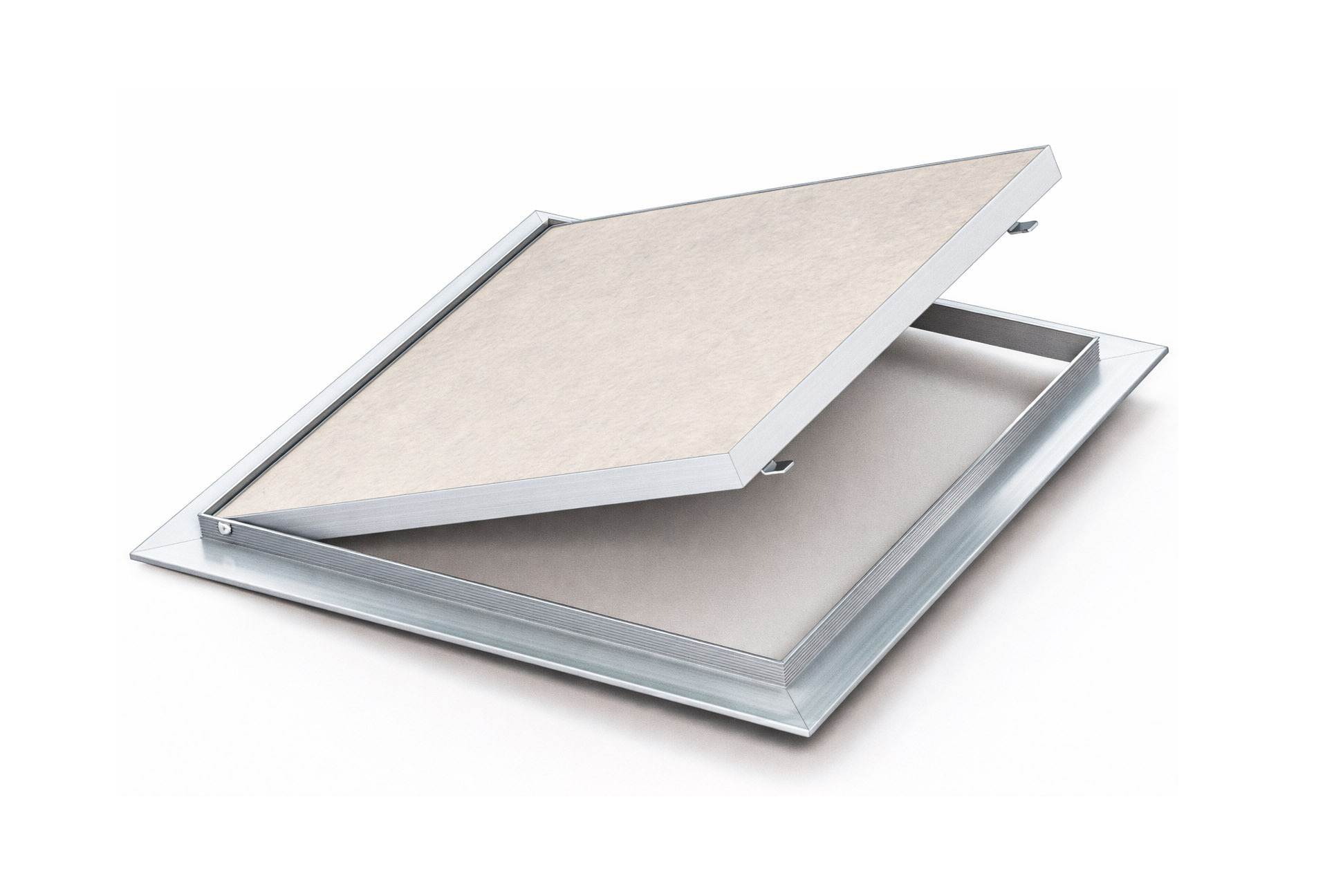 Odolná hliníková dvířka s vyztuženými lisovanými rohy a pevnými panty. Snadné otevírání díky dvěma tlačným zámkům, bílá deska upevněná šrouby nebo lepidlem. Minimální spára a rychlá povrchová úprava.