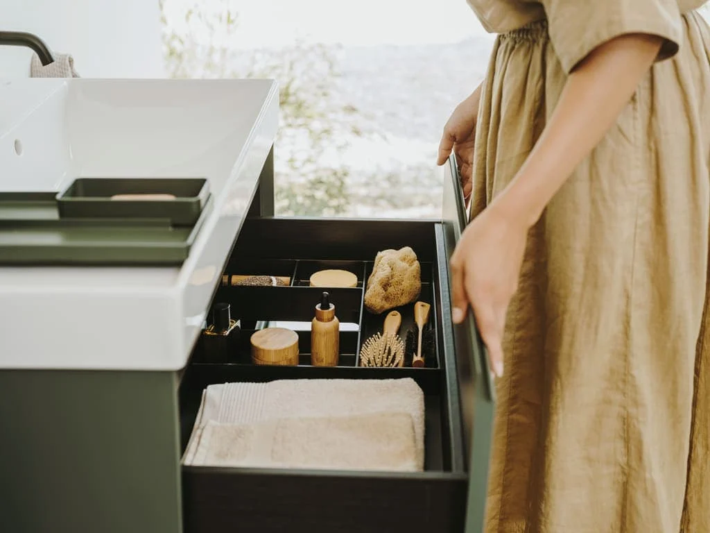 Závěsná koupelnová skříňka s keramickým umyvadlem v zelené barvě s matným povrchem o rozměru 60x64,5...