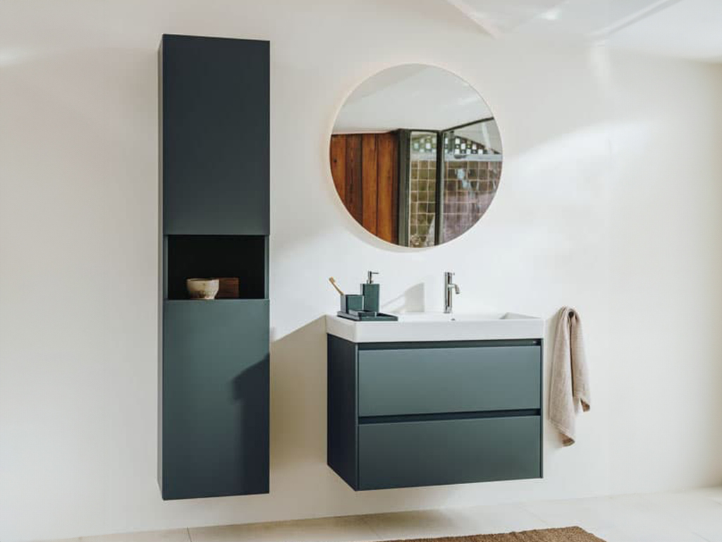 Závěsná koupelnová skříňka vysoká s matným povrchem. Povrch v provedení lamino. Push otevírání s dot...