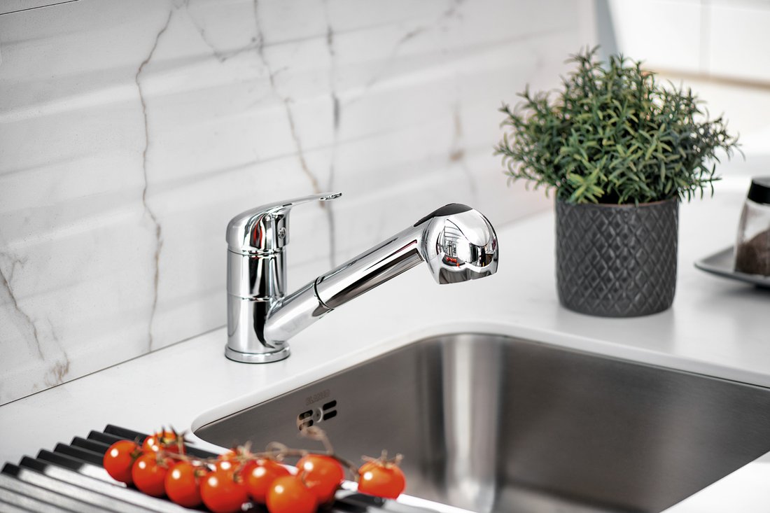Stojánková páková dřezová baterie, s otočným ramínkem a výsuvnou sprškou. Možnost vytažení spršky až...