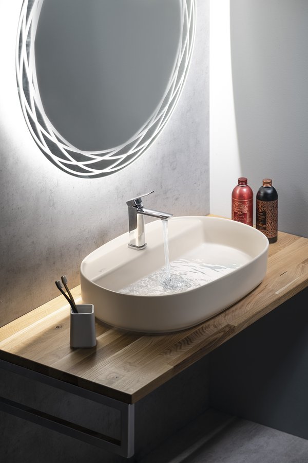 Tenkostěnné bílé matné keramické umyvadlo na desku 55x36 cm. Umyvadlovou výpusť nutno dokoupit....