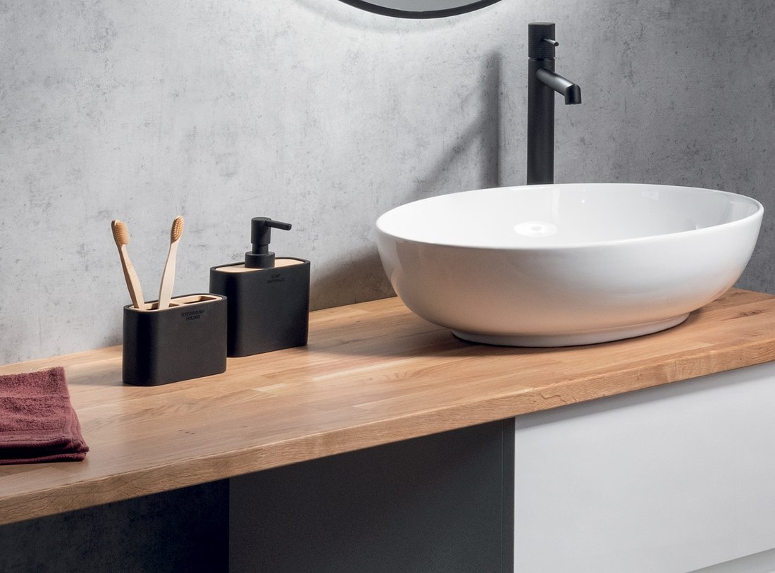 Koupelnová sklenka na postavení, černá/bambus.