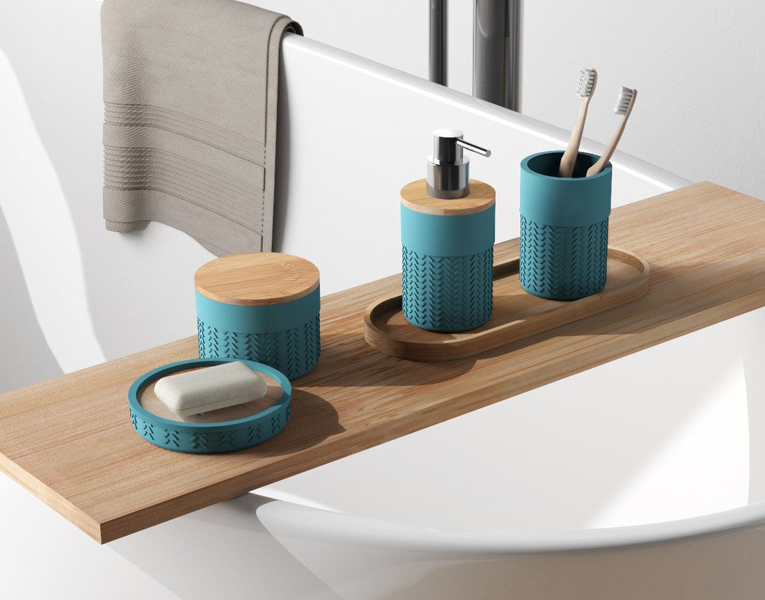 Elegantní koupelnové doplňky v matně zelené barvě doplněné bambusovým dřevem.