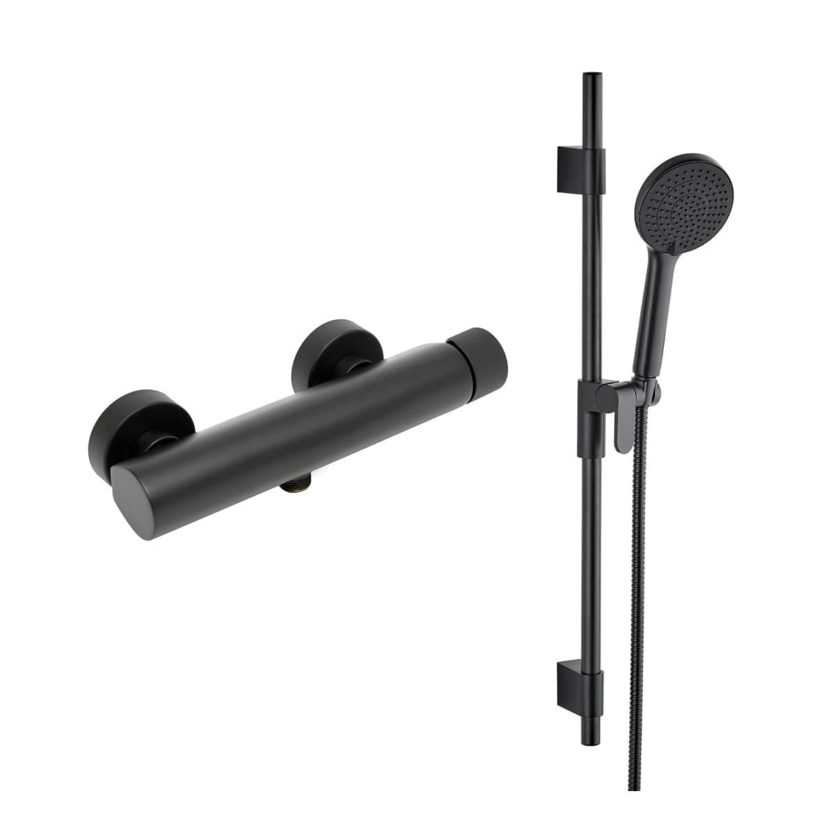 Páková nástěnná sprchová baterie se sprchovým setem v barvě černá matná. Rozteč baterie 150 mm. S matným povrchem.