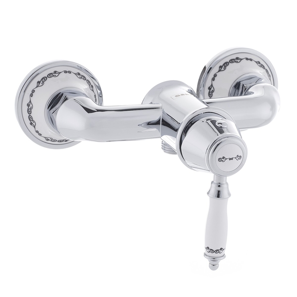 Páková nástěnná sprchová baterie bez sprchového setu. V retro designu. V chromovém provedení. Rozteč baterie 150 mm.