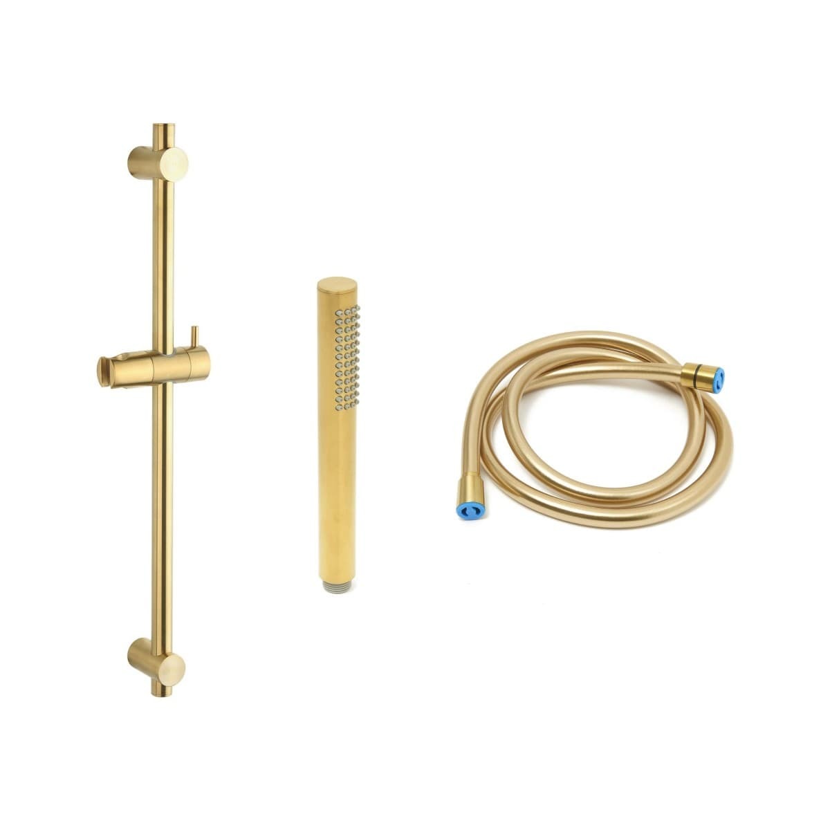 Elegantní posuvný sprchový set v broušené zlaté úpravě kombinuje moderní design, kvalitu a praktičnost. Povrch je odolný proti korozi, snadno se udržuje a zachovává atraktivní vzhled i po letech používání.