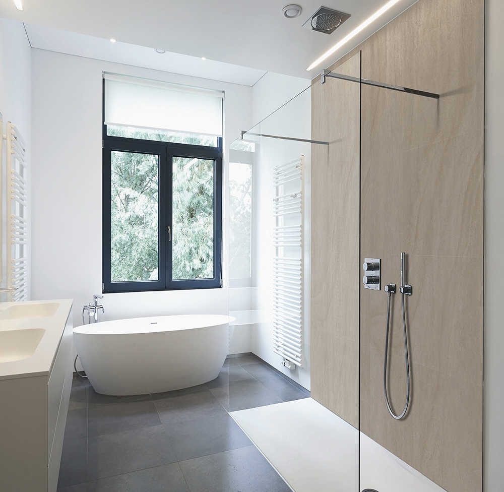 Desky velkých formátů se díky jejich lehkosti snadno přilepí na stěnu – ať už na stávající obklad při renovaci koupelny na přímo na omítku (sádrokarton) ve vaší novostavbě.