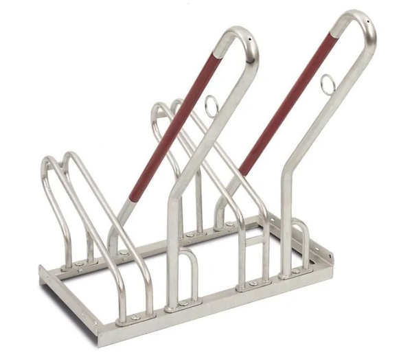 Stabilní stojan na kola ze žárově zinkované oceli, s opěrným obloukem, na 2 kola. Součástí dodávky 2 kotvy do země.