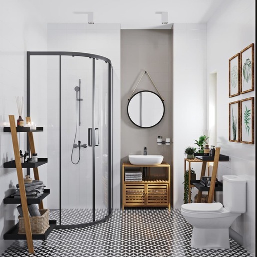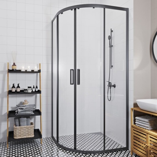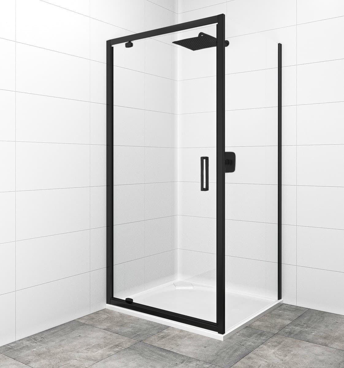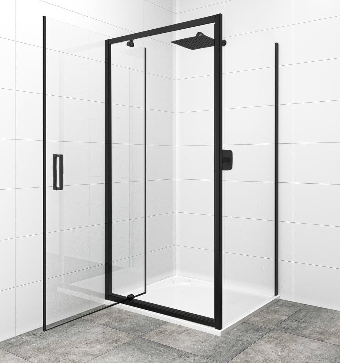 Sprchový kout včetně boční zástěny v černé barvě, výplň je z čirého skla bez dekoru. Produkt je opat...