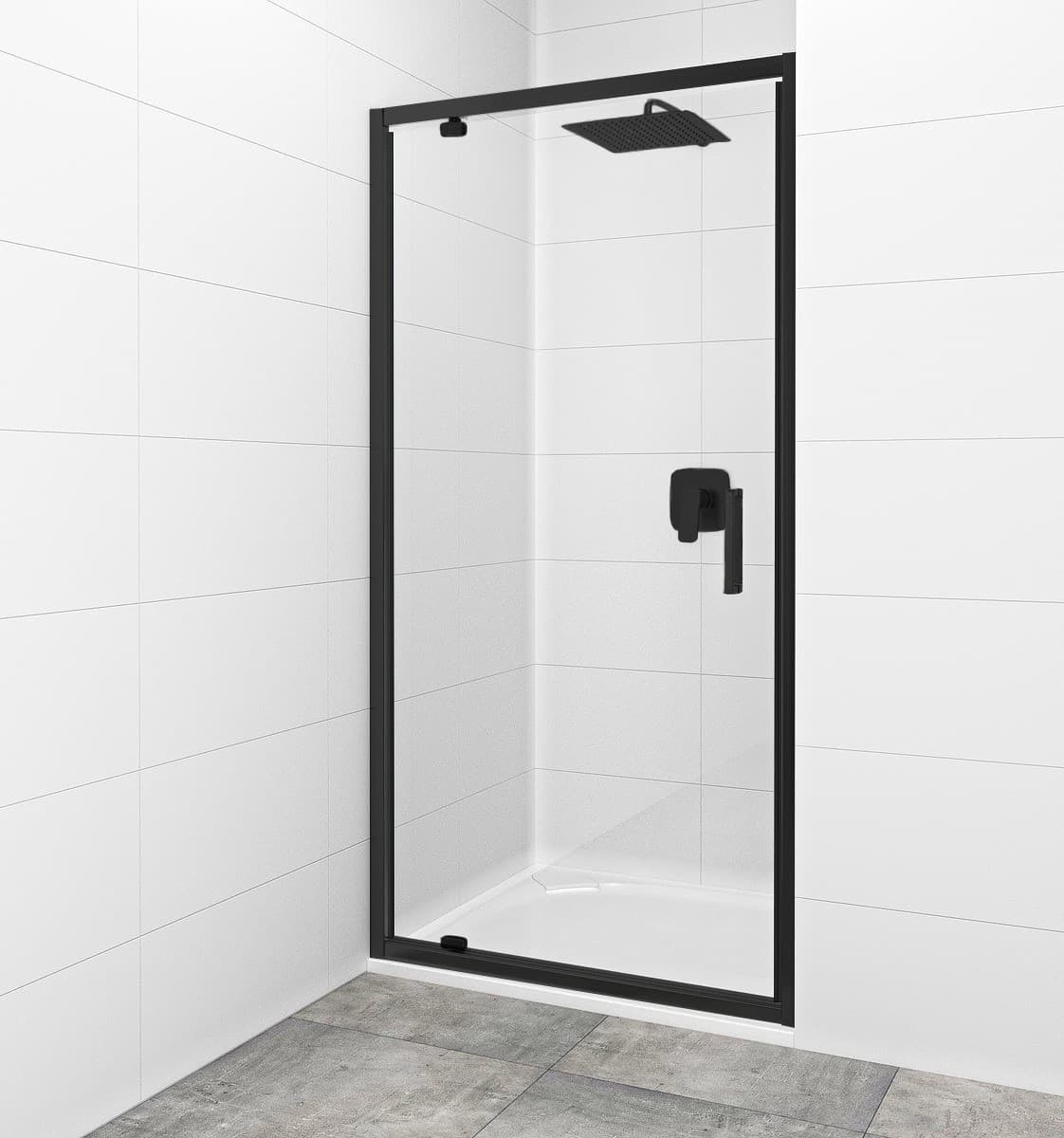 Sprchové dveře bez madel a vaničky v černém provedení, výplň je z čirého skla bez dekoru. Otočný sys...