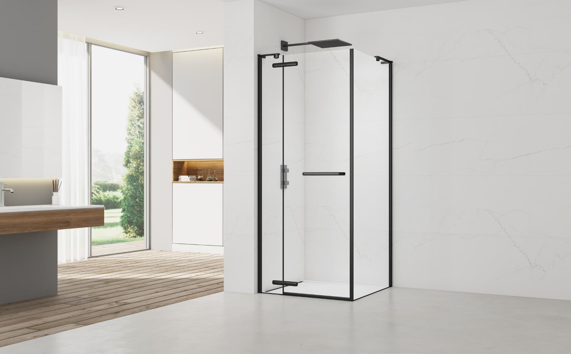 Sprchový kout bez vaničky 90x90cm v černém matném provedení, výplň je z čirého skla bez dekoru. Prod...