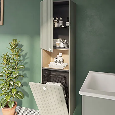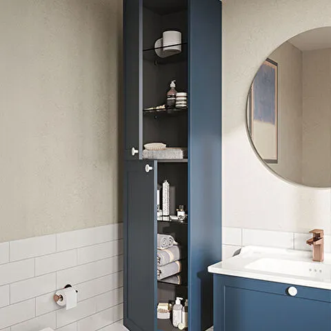 Závěsná koupelnová skříňka vysoká v modrém provedení s matným povrchem o rozměru 40x180x35 cm. Povrc...
