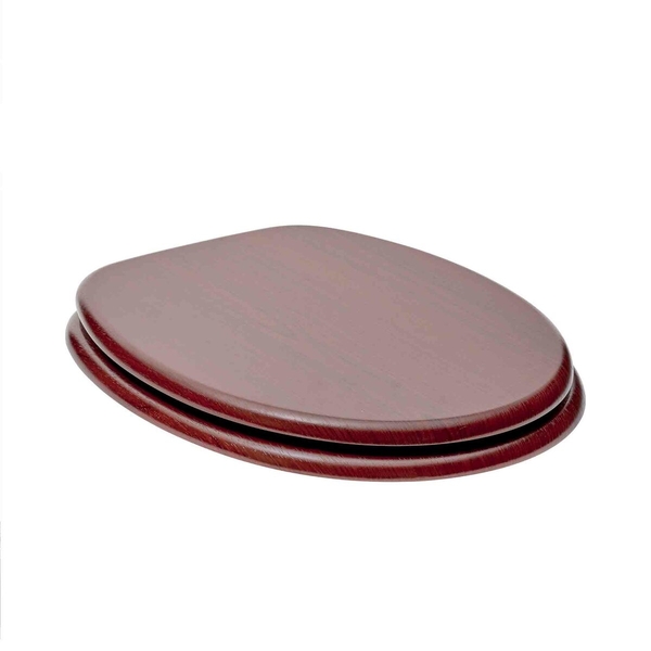 WC sedátko z MDF desky potažené PVC fólií, barva Mahagon, s panty z kvalitní pochromované mosazi zajišťující vysokou životnost, s uchycením na WC.